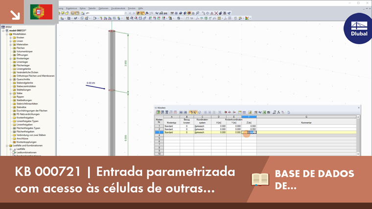In den Bildern ist dargestellt, wie mit dem Eintrag $1.1(F3) auf eine Koordinate in Tabelle 1.1 verwiesen wird. O número da célula F3 é apresentado entre parênteses. Com esta referência, a carga nodal é ajustada automaticamente se a coordenada Z do nó muda. A carga depende, portanto, da posição do nó.