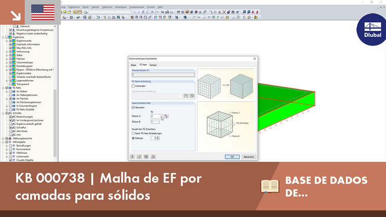 Para sólidos, existe outra opção de configuração da malha de EF. É possível dispor uma malha de EF por camadas, além de um refinamento global da malha de EF. Para esta opção, pode realizar uma divisão definida do sólido com elementos finitos entre duas superfícies paralelas. Esta opção é particularmente adequada para geometrias de sólidos muito grandes com altura pequena.