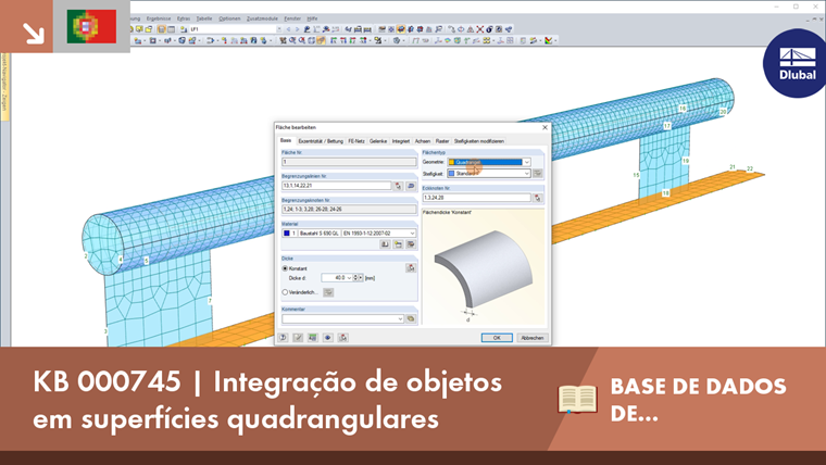 RFEM bietet jedoch eine Option an, welche die Objektintegration für Quadrangelflächen erleichtert: Utilizando o botão [Integrar objetos na superfície], o RFEM determina todos os nós, linhas e aberturas que são relevantes para a integração devido às suas condições geométricas. Em seguida, eles aparecem na lista de objetos integrados, que podem ser verificados rapidamente.
