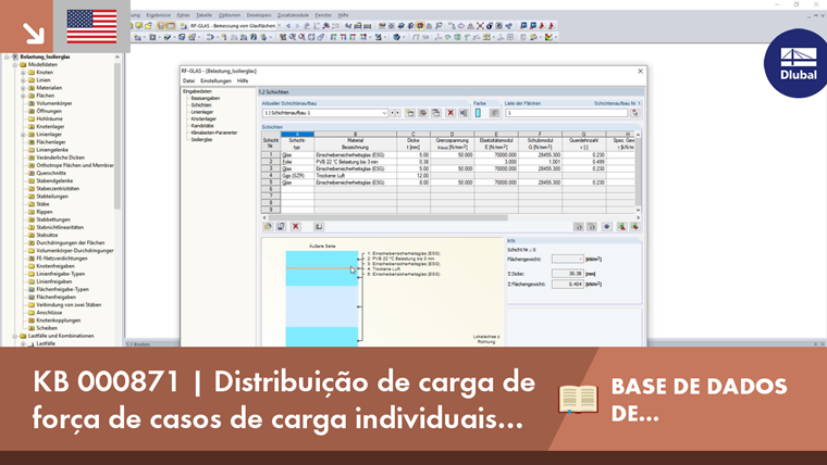 Neste caso, a carga de vento deve atuar na camada externa e a carga de proteção contra quedas deve atuar na camada interna. No RF-GLASS, é possível fundir os casos de carga individuais numa combinação de cargas (CO) e, simultaneamente, atribuir os casos de carga contidos separadamente aos diferentes lados de vidro (Tabela 1.7) e realizar o cálculo.