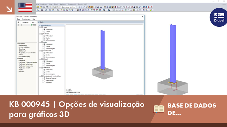 Uma função especial permite exibir ou ocultar separadamente os componentes individuais da ligação, bem como as linhas de dimensão e os detalhes de soldadura, por exemplo. A seleção é possível no navegador à esquerda do gráfico.