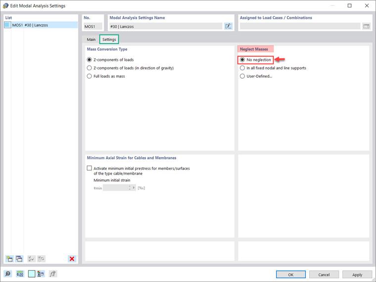 Como esses problemas frequentemente surgem, o RFEM 6 permite que você negligencie a massa de certas partes da estrutura para o propósito da análise modal. A forma como as massas devem ser consideradas na análise modal pode ser definida nas configurações da análise modal, conforme mostrado na Imagem 2. Em contraste com a opção "Sem negligência" (ou seja, nenhuma massa será negligenciada), você pode escolher entre duas opções para negligenciar massas: negligenciar a massa em todos os apoios nodais e de linha fixos, ou criar uma seleção dos objetos individuais você mesmo.