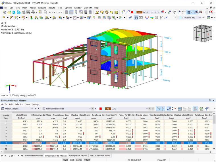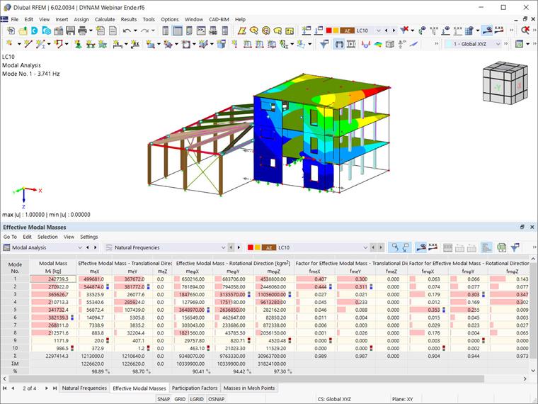 Finalmente, você pode executar a análise modal com essas configurações e obter os resultados como mostrado na Imagem 10. Desta vez, os 90% necessários são alcançados com o cálculo de apenas 10 modos, e o tempo de análise é significativamente menor.