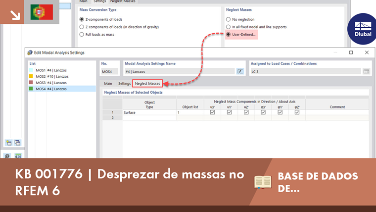 No entanto, você pode selecionar a opção “Definido pelo Usuário” e selecionar manualmente objetos para os quais as massas devem ser negligenciadas para a análise modal. Ao selecionar esta opção, uma nova aba (“Negligenciar Massas”) estará disponível para você especificar sua seleção de objetos (Imagem 3). Primeiro, você é solicitado a especificar o tipo de objeto entre os seguintes: nó, linha, membro, superfície e nó sem apoio.