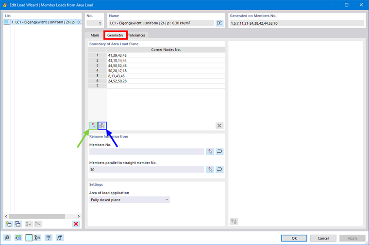 As duas funções já conhecidas do RFEM 5 "Carga de superfície em barras através de planos" e "Carga de superfície em barras através de células" podem ser encontradas no RFEM 6 no assistente de carga "Cargas de barra a partir de carga de superfície". Pode definir planos através de nós (marcados em verde na imagem) ou selecionar células (marcadas em azul na imagem).