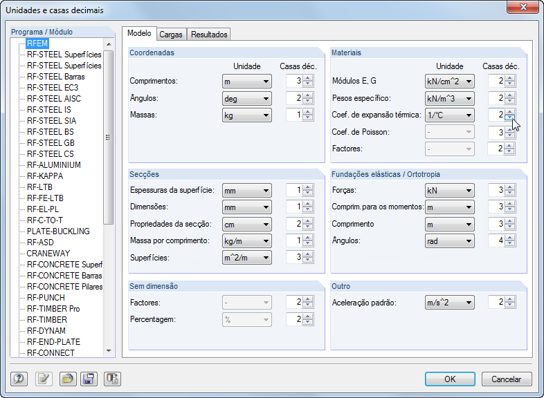 Uma caixa de diálogo global gere as unidades para os dados de entrada, as cargas e os resultados para o RFEM e o RSTAB, bem como os módulos adicionais.