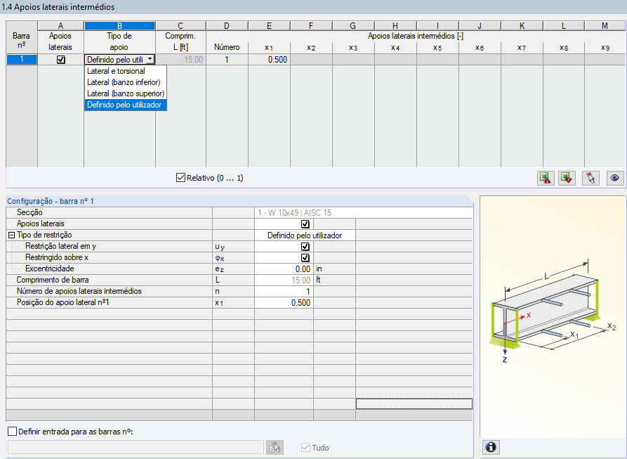 No RF-/STEEL AISC, existe a possibilidade de considerar restrições laterais em quaisquer posições. Por exemplo, é possível reforçar somente o banzo superior.