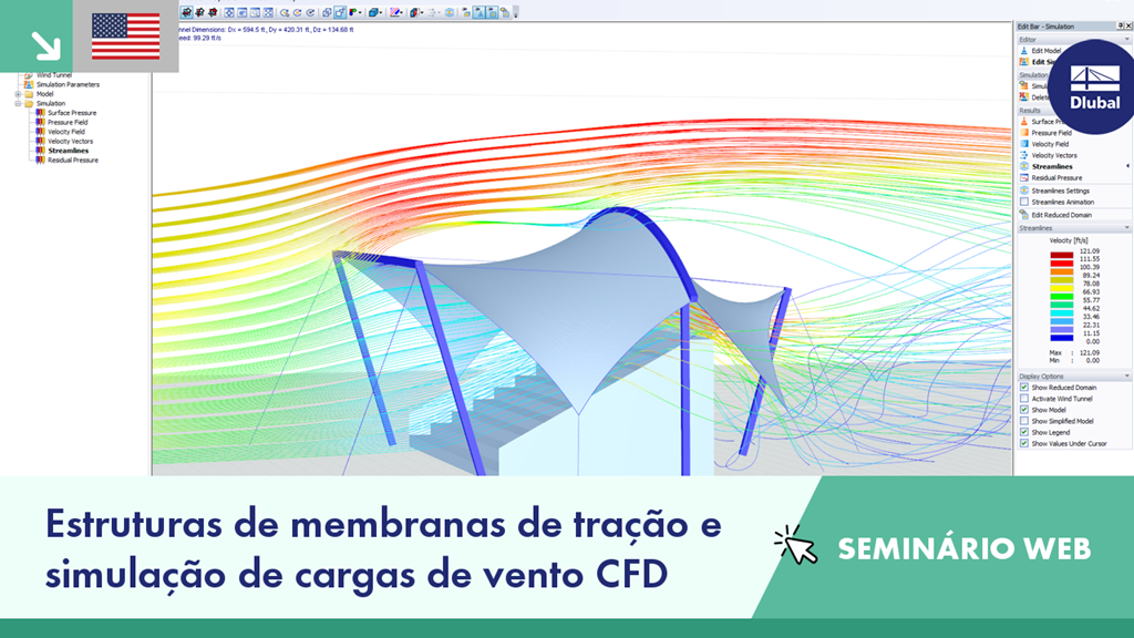 Este seminário web demonstra o fluxo de trabalho geral para o dimensionamento de estruturas de membranas com tração no RFEM, incluindo análises de cargas de vento CFD utilizando o RWIND Simulation.