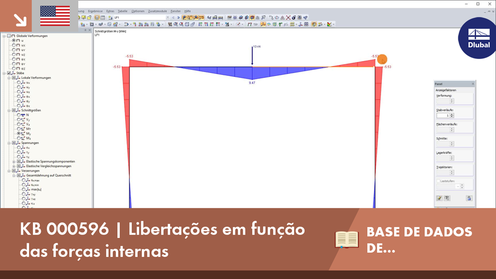 No RFEM e no RSTAB, é possível definir propriedades não lineares das libertações da barra. Além dos diagramas de atividades e da relação força-deformação, também existe a opção de utilizar simplesmente os sinais das forças internas como critério para a eficácia do desbloqueio. Desta forma, pode especificar quais as forças internas que devem ser transferidas na extremidade da barra.