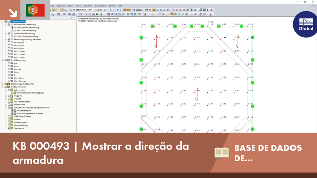 No RF -CONCRETE Surfaces, é dimensionada uma armadura de superfície utilizando uma malha de armadura definida livremente. Pode visualizar a direção da armadura no RF -CONCRETE Surfaces ativando a seta de armadura que simboliza a direção da armadura.