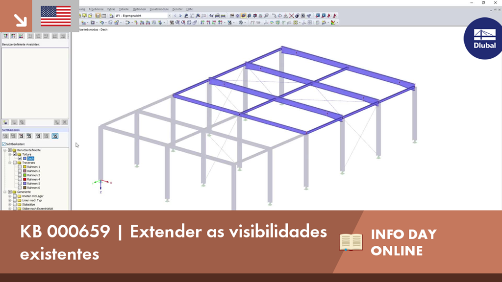 As visibilidades definidas pelo utilizador facilitam o manuseamento do programa. Uma vez criados, todos os grupos de modelos podem ser rapidamente ocultados ou exibidos. Isso facilita, entre outras coisas, a análise dos resultados em estruturas 3D maiores, mas também a criação do relatório. Ao alterar a geometria, as visibilidades existentes podem ter de ser atualizadas.