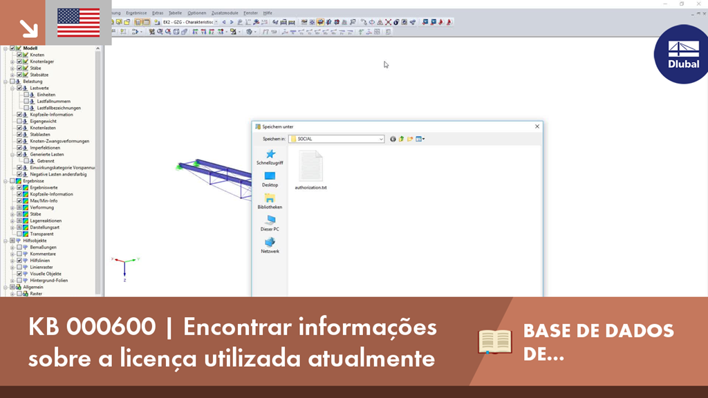 No RFEM 5 e no RSTAB 8 é possível visualizar informação detalhada sobre a licença atualmente utilizada e o controlador de dongle instalado. Em caso de problemas com a licença, pode enviar o ficheiro de texto criado para a linha de apoio ao cliente da Dlubal Software, o que nos permite uma análise rápida e eficaz. Para criar o ficheiro, selecione "Ajuda" → "Autorização" → "Diagnóstico".