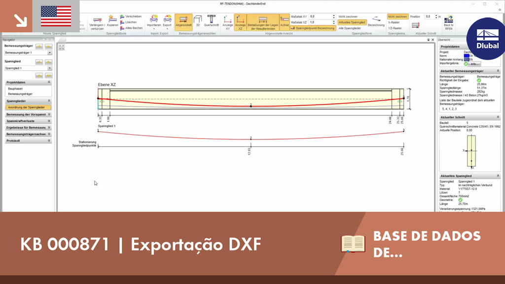 Depois de determinar a geometria final do tendão no RF -TENDON, pode ser útil exportar o modelo para um programa CAD. Para este efeito, o módulo inclui a opção de exportar o ficheiro no formato .dxf. Você pode selecionar a função de exportação clicando com o botão direito do mouse na área de trabalho. Após selecionar o formato DXF e o local de armazenamento, podem ser feitas configurações adicionais.