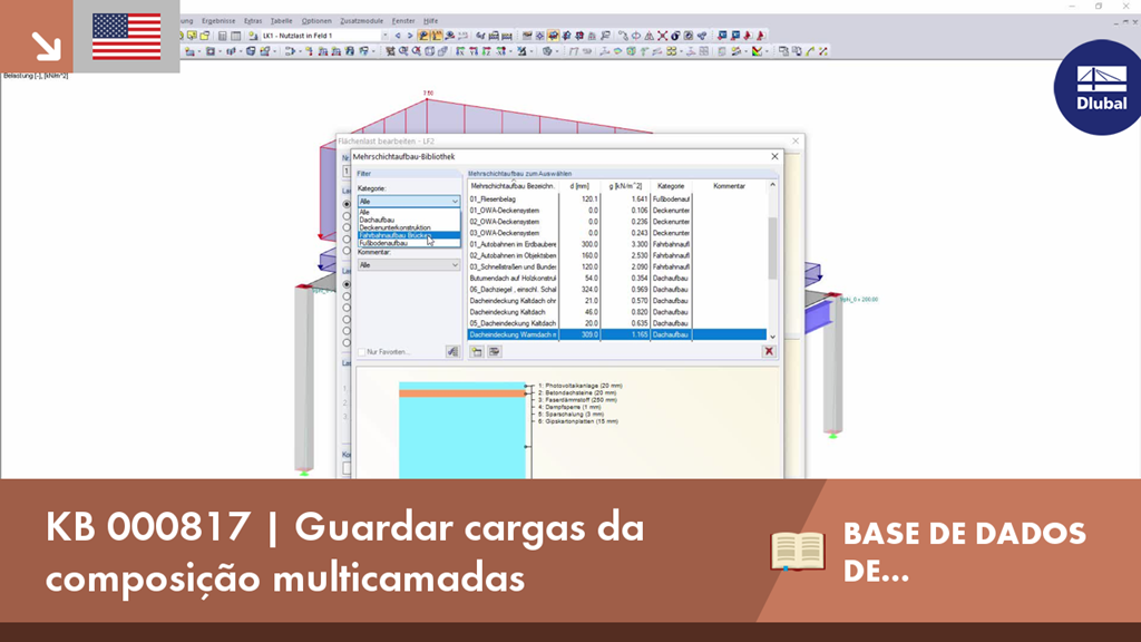 No RFEM e no RSTAB é possível gerar cargas a partir da composição multicamadas. A biblioteca de composição multicamadas já contém algumas estruturas de pisos e coberturas. No entanto, esta biblioteca pode ser editada e ampliada conforme desejado. Também pode partilhar as suas composições definidas pelo utilizador com outros computadores, evitando assim a necessidade de recriar as composições de diferentes utilizadores dentro de uma empresa. Basta copiar o ficheiro "MultiLayer_User.db3" para o mesmo diretório da biblioteca de composição multicamadas no outro computador. Pode verificar isso através dos respetivos diretórios da base de dados na caixa de diálogo "Opções do programa".