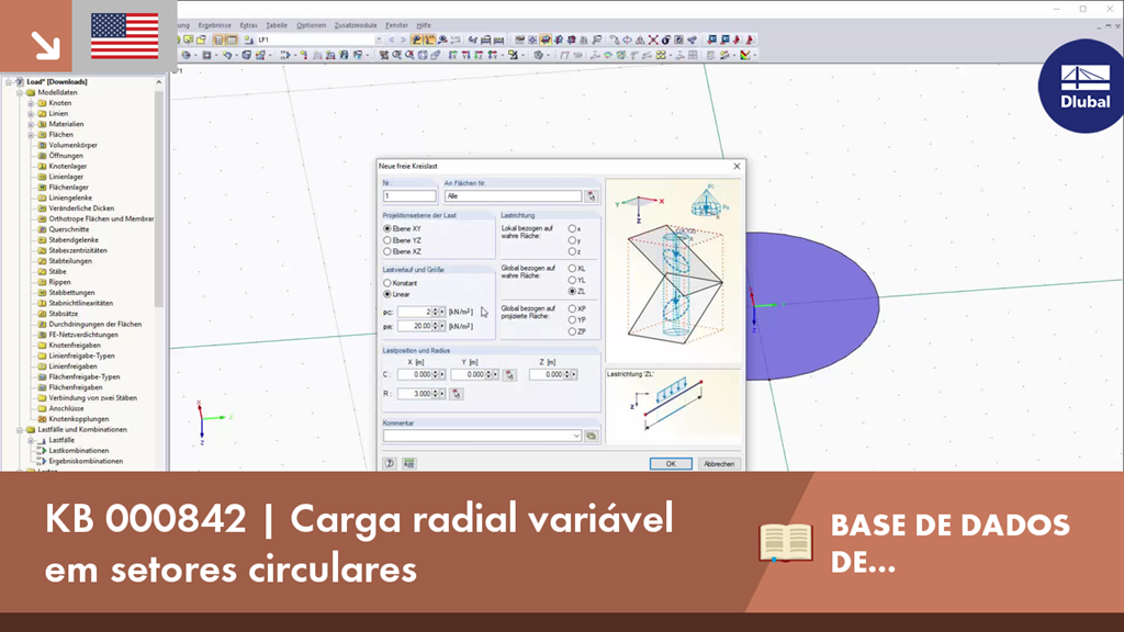No RFEM, as cargas podem ser definidas livremente nas superfícies. É impossível, no entanto, definir um carregamento variável em, por exemplo, superfícies circulares. No entanto, ainda é possível criar este tipo de carga utilizando uma carga circular livre.