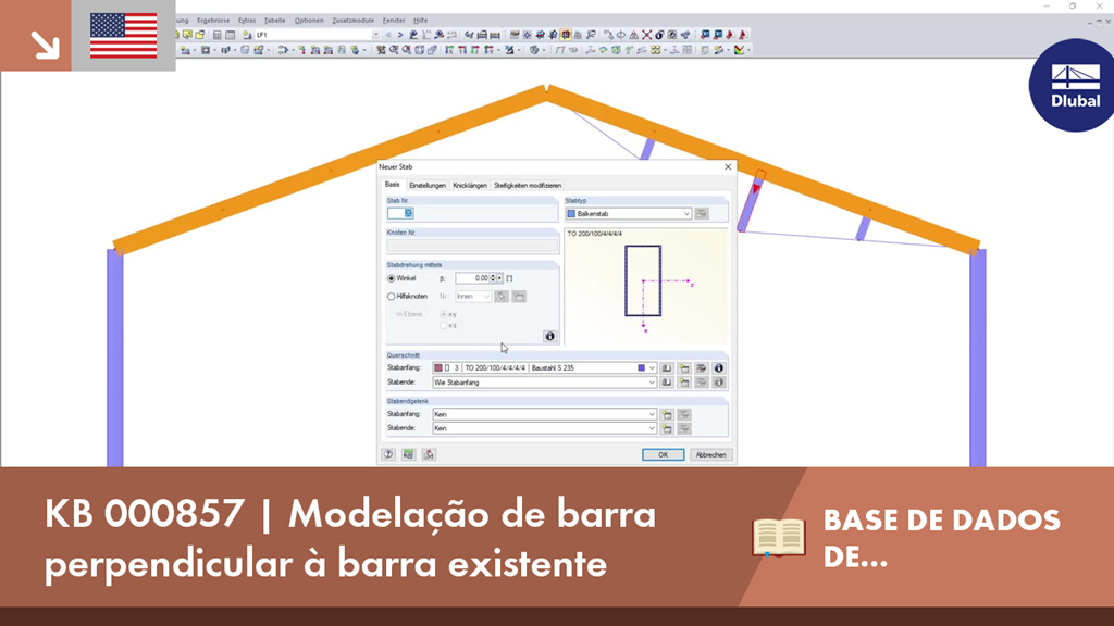 Para um pórtico treliçado a partir de baixo, as barras de compressão devem ser modeladas perpendicularmente à viga inclinada. O comprimento da barra e a interseção com a viga horizontal são definidos.