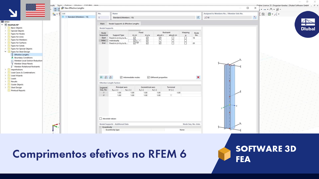 Este vídeo mostra como atribuir comprimentos efetivos. Para realizar uma análise de estabilidade no Dimensionamento de aço, é necessário determinar a definição dos comprimentos efetivos. Após atribuir o comprimento efetivo a um objeto, as configurações são consideradas no dimensionamento de estabilidade.