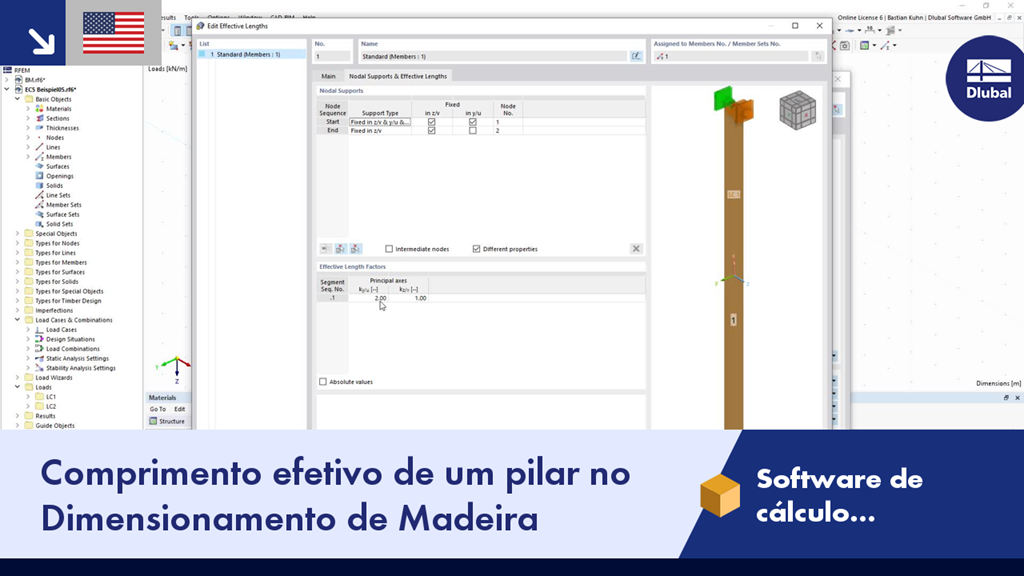 Neste vídeo, pode ver como definir diferentes comprimentos efetivos para um pilar. Além disso, uma redução da rigidez causada pela fluência também pode ser considerada para a análise de estabilidade no módulos Dimensionamento de madeira, que também é apresentada.