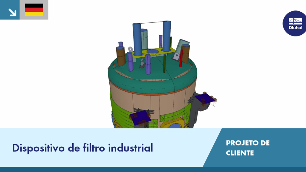 Para o projeto de dimensionamento do dispositivo de filtro/secador e um agitador, foi efetuada uma análise completa de tensões e deformações com o RFEM. A particularidade da estrutura residiu na complexa modelação com 1424 superfícies, 158 sólidos e 425 barras.
