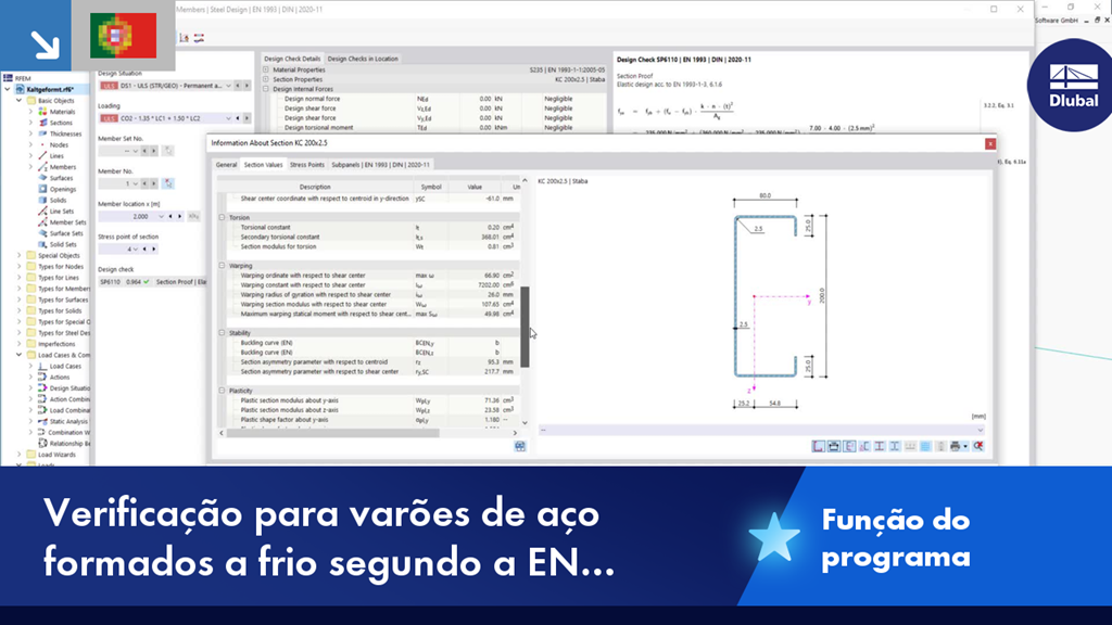 Quer se trate de perfis formados a frio da base de dados de secções ou de secções gerais formadas a frio (não perfuradas) RSECTION, o seu programa de cálculo estrutural irá ajudá-lo a determinar a secção efetiva tendo em consideração a encurvadura local e a instabilidade da forma. Também é possível realizar a verificação de secção de acordo com a EN 1993-1-3, 6.1.6. Os esforços internos do cálculo de torção com empenamento (7 GDL) são considerados através da verificação de tensões equivalentes.
