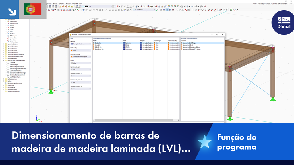 No RFEM e no RSTAB, pode dimensionar barras com o tipo de material "Madeira laminada folheada". Estão disponíveis os seguintes fabricantes:
