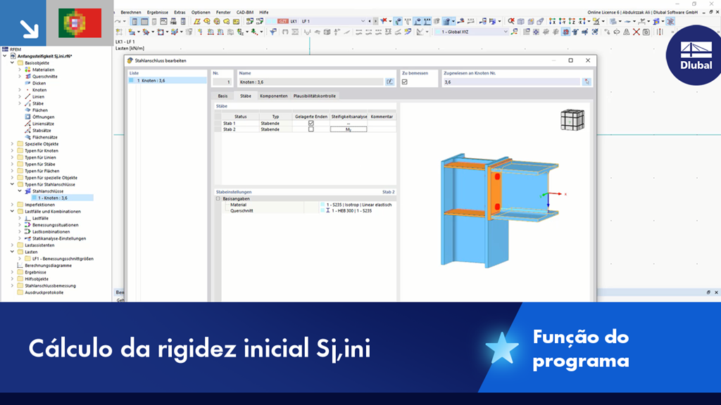 No módulo Ligações de aço, pode determinar a rigidez inicial Sj,ini de acordo com o Eurocódigo e a AISC. Isto pode ser feito para barras selecionadas com referência aos esforços internos N, My e Mz.