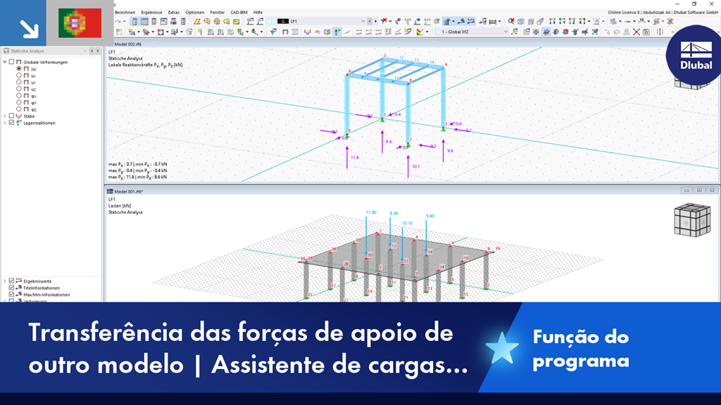 A transferência de cargas a partir de casos e combinações de cargas pode ser realizada de forma automática ou manual. É necessário que os modelos estejam guardados no mesmo projeto do Dlubal Center.