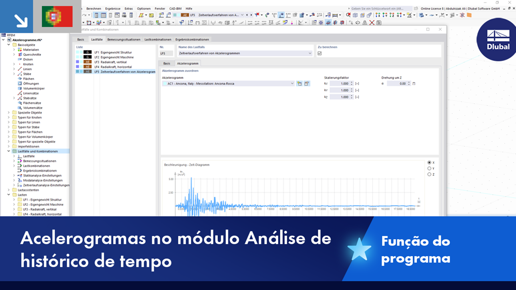 No módulo Análise de histórico de tempo, estão disponíveis os acelerogramas para o cálculo. Esta extensão permite a análise estrutural dinâmica de diagramas de aceleração-tempo.
