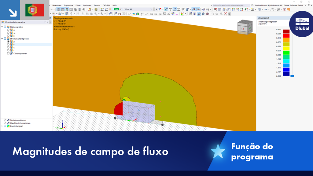 No RFEM e no RSTAB, é possível visualizar as magnitudes de campo de fluxo da pressão, da velocidade, da energia de turbulência cinética e da taxa de dissipação da turbulência para a simulação de vento.