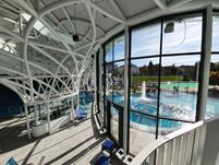 Die Konstruktion aus Stahl und Stahlbeton zieht sich über zahlreiche Badebereiche, in denen das Beleuchtungssystem dank der elegant-verspielten Stahlkonstruktion für verschiedenste Lichtstimmungen sorgt. Ob Rutschenturm, Schwimmerbecken, Bistro, die neue Wasserspiellandschaft oder die kostenlose Dampfsauna: Hier findet alles einen Platz.