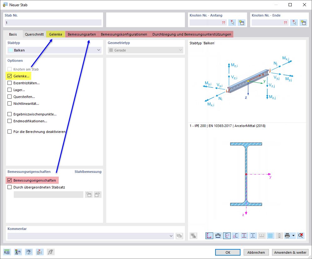 Caixa de diálogo de entrada 'Nova barra' com separadores para as propriedades de articulação e de dimensionamento