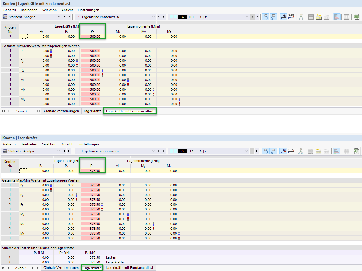 Статический анализ – опорные силы с учётом и без учёта собственного веса фундамента