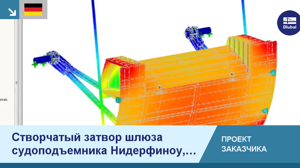 Моделируемым объектом является шлюз, который должен посредством давления регулировать уровень воды в плотине. Ширина створки шлюза притом составляет 7 м, а общая ширина конструкции достигает почти 10,4 м. Максимальный уровень воды в шлюзе затем может достигать высоты 5,6 м. Вся конструкция сделана из стали S 355.