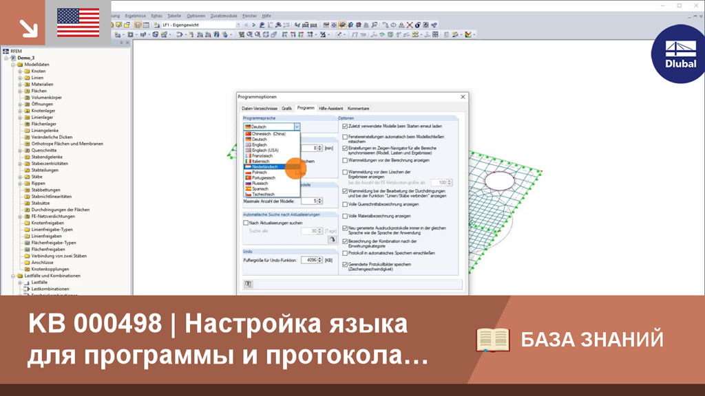 Программы RFEM, RSTAB и SHAPE‑THIN локализованы для одиннадцати языков, которые доступны автоматически, т.е. без дополнительной оплаты. Язык пользовательского интерфейса можно в программе легко определить с помощью меню «Возможности» → «Возможности программы...». Но что более полезно, язык протокола результатов не зависит от языка интерфейса программы. Таким образом можно в пользовательском интерфейсе на итальянском языке без проблем создать протокол результатов, например, на испанском.