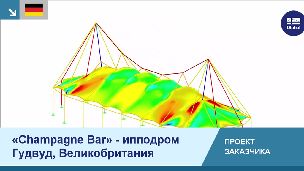 Для проектирования конструкции новой кровли в баре «Champagne» на ипподроме Гудвуд была выбрана компания LEICHT. Она отвечала за все этапы проектирования, которые включали в себя процесс поиска формы, согласование и расчет мембраны и несущей стальной конструкции, а также расчет раскройных формы мембраны и тросов.