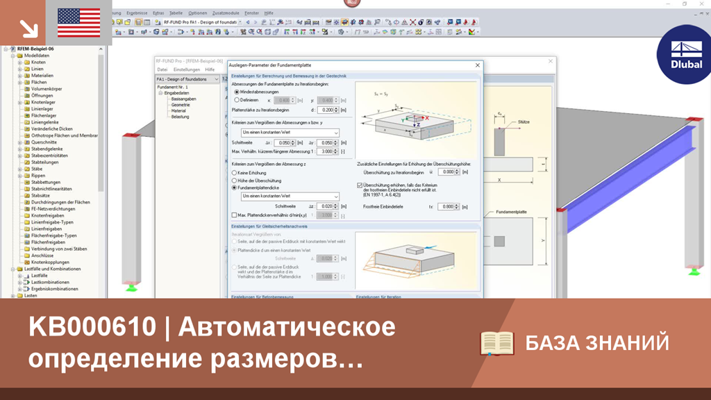 В дополнительном модуле RF-/FOUNDATION Pro можно выбрать автоматическое определение размеров геометрии фундаментной плиты. В диалоговом окне расчетных параметров фундаментной плиты можно, например, задать шаг увеличения площади основания и толщины фундаментной плиты. Вы также можете автоматически увеличить покрытие для стабилизации геотехнических расчетов.