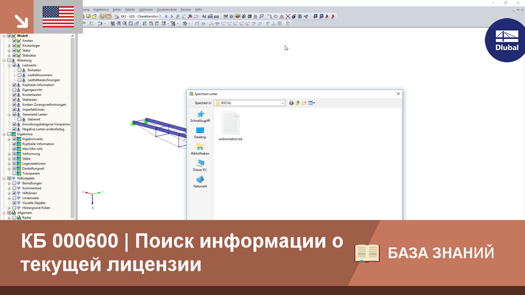 В программе RFEM 5 и RSTAB 8 можно просмотреть подробную информацию об используемой лицензии и установленном драйвере ключа. В случае возникновения проблем с лицензией, затем можно отправить соответствующий текстовый файл на горячую линию компании Dlubal Software, и таким образом значительно ускорить обработку своего запроса. Для создания файла выберите «Помощь» → «Авторизация» → «Диагностика».