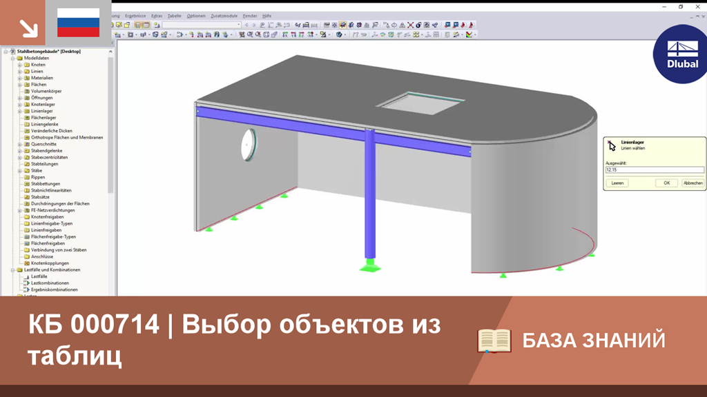 В таблицах RFEM 5 и RSTAB 8 список объектов можно выбрать графически с помощью мыши. Это дает то преимущество, что, например, можно быстро присвоить определенные настройки линейной опоры другим линиям.