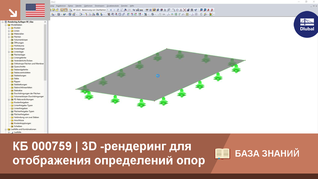 В дополнительном модуле RF-GLASS реализован 3D-рендеринг для облегчения определения условий опоры. Эта интерактивная графическая визуализация облегчает ввод и управление линейными и узловыми опорами. Тем не менее, при необходимости можно выбрать и схематическое изображение.