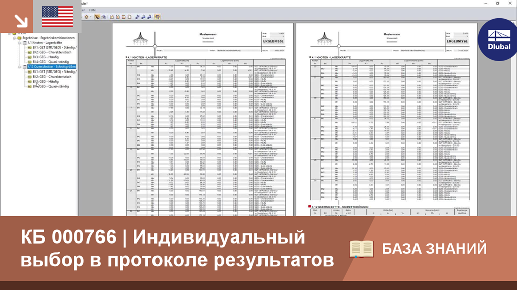 Содержимое, отображающееся в таблицах загружений и результатов, можно определить в общем выборе протокола результатов (отмечен красным). Отдельный выбор (зеленый) позволяет дополнительно назначать различные сочетания нагрузок для соответствующих таблиц. Поскольку этот конкретный выбор противоречит глобальному, была добавлена проверка (фиолетовый). Таким образом, индивидуальный выбор заменяется только в том случае, если вы отметите этот флажок.