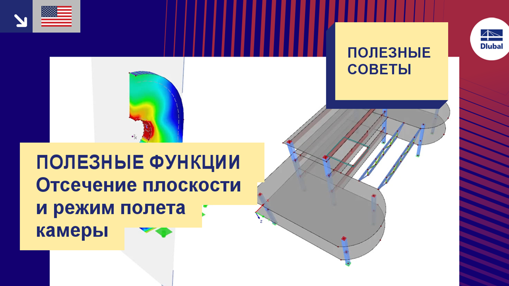 В данном видео показаны две весьма интересные функции программ Dlubal Software. Первой из них является плоскость отсечения, которую можно создать с помощью плоскости разреза через модель для отображения результатов в определенных местах, а вторая - это режим полета камеры, который позволяет осуществить виртуальный 3D просмотр всей модели.