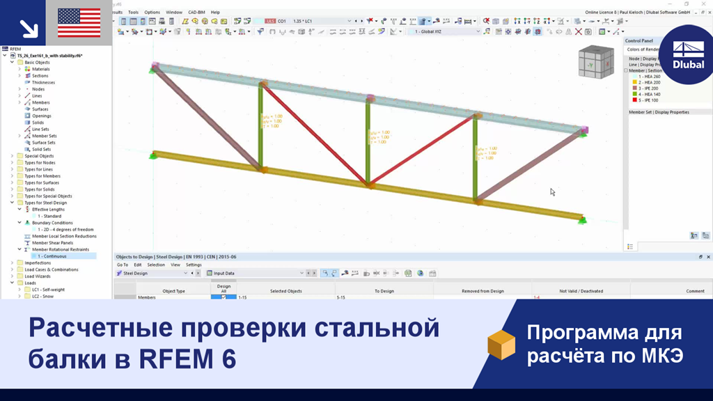 В этом видео вы можете увидеть, как эффективная длина и граничные условия для расчета устойчивости могут быть назначены стержням и блокам стержней. Если это было сделано, программа может автоматически выполнить расчет сечения и устойчивости данной балки.