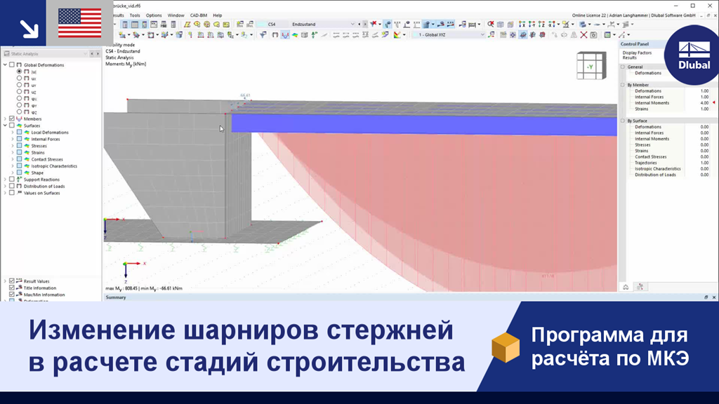 В данном видео показано изменение шарниров стержней в расчете стадий строительства. Такая ситуация возникает, например, при бетонировании поверх стальной балки.
