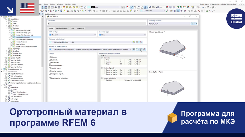 В этом видео вы можете увидеть, как можно задать ортотропные и изотропные материалы с помощью типа толщины материала в RFEM 6. Ортотропный материал описывает поведение материала, при котором на 2D-поверхности может быть определена более высокая жесткость в направлении x оболочки по сравнению с направлением y оболочки. Для 3D тел также можно задать другое поведение материала в направлении z.