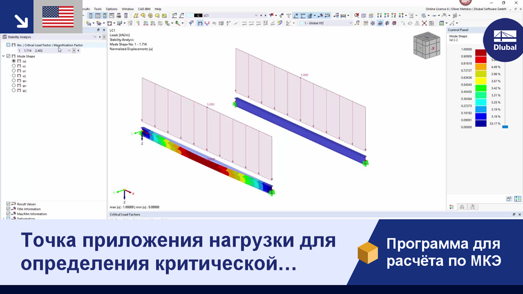 В данном видео мы покажем определение внецентренной нагрузки на стержень и ее влияние на коэффициент критической нагрузки при потере устойчивости плоской формы изгиба. В данном случае нагрузка, действующая на сжатую полку, будет иметь дестабилизирующий эффект, что правильно учтено в программе RFEM. Мы используем аддон RFEM 6 для расчета устойчивости и деформации при кручении (7DOF).
