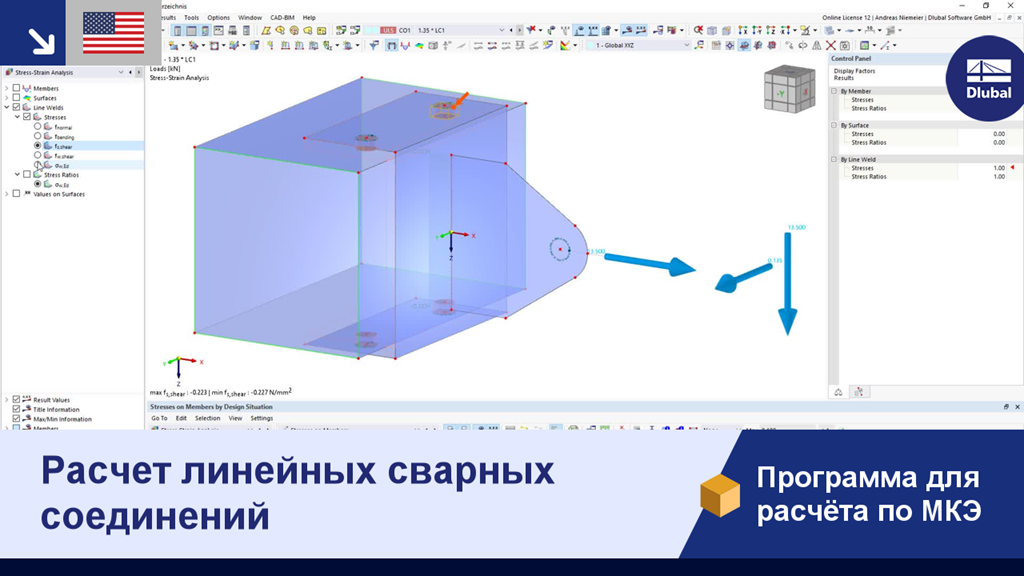 В данном видео мы покажем, как расчитывать швы, выполненные линейной сваркой. Эта задача решается в RFEM 6 с помощью аддона «Stress-Strain Analysis», который позволяет задать геометрию шва и предельное напряжение шва.