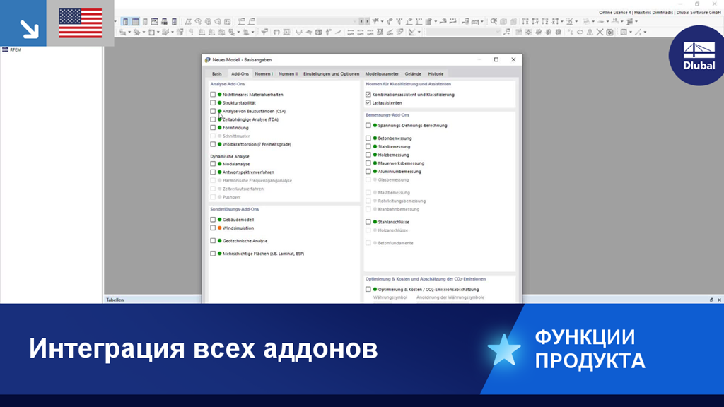 Все аддоны автоматически интегрируются в программы RFEM 6 или RSTAB 9. За счёт этого достигается слаженное взаимодействие между отдельными частями программы (например, вычисление опрокидывающиего момента для деревянных балок в аддоне Депланация при кручении (7 СтСв), учёт поэтапных процессов поиска формы с помощью аддона Расчёт стадий строительства (CSA) и т.д.).