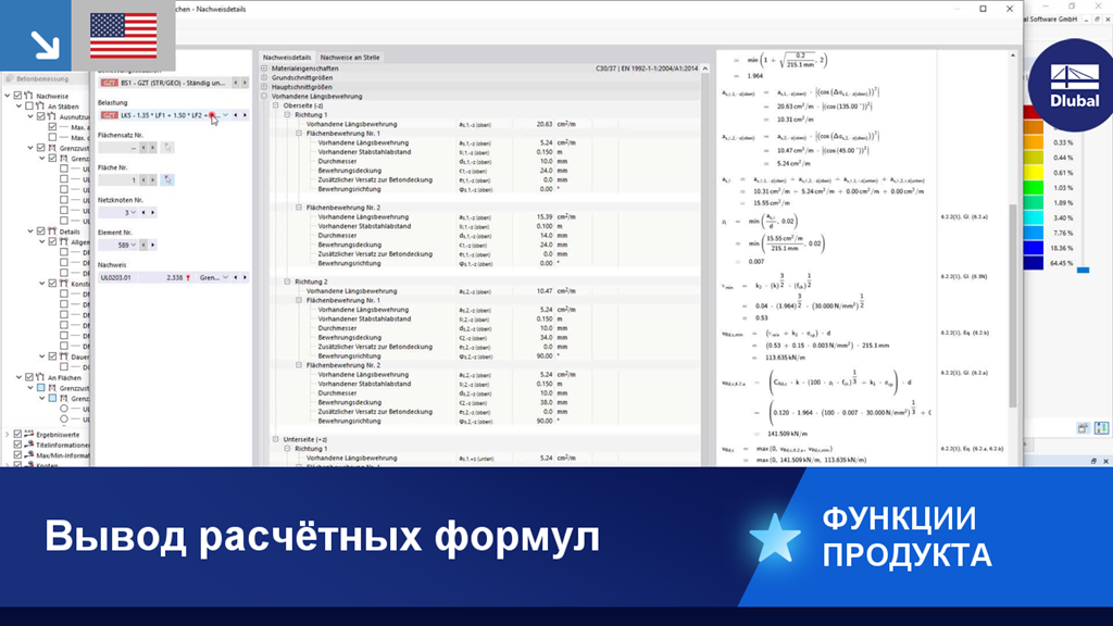 При расчётах железобетонных, стальных, деревянных, алюминиевых и пр. конструкций отображаются подробные формулы проверки расчёта (включая ссылку на используемое уравнение из соответствующей нормы). Эти формулы также можно включить в протокол результатов.