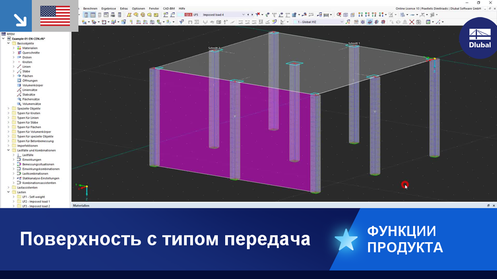 Поверхность с типом жесткости «Передача нагрузки» не оказывает статического воздействия на модель. Её можно использовать для учёта нагрузок от поверхностей, которые не были смоделированы (например, фасадные конструкции, стеклянные поверхности, кровельные профлисты и т.д.).