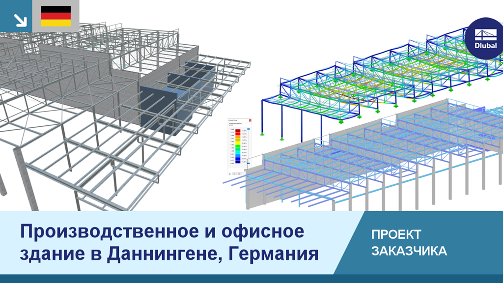 Проект заказчика был преобразован в программу RFEM 6 для создания презентационного видео. На видео вы можете увидеть работу с моделью в программе, а также результаты реальных деформаций.